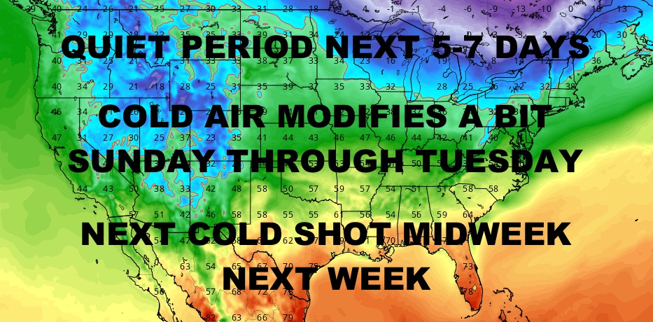 Good morning everyone. Now that we pretty much have all of our weather events out of the way, we are relatively dry and quiet across a wide area of real estate. Cold weather remains locked into the Northeast, Southeast, and South, but things will begin to slowly modify.