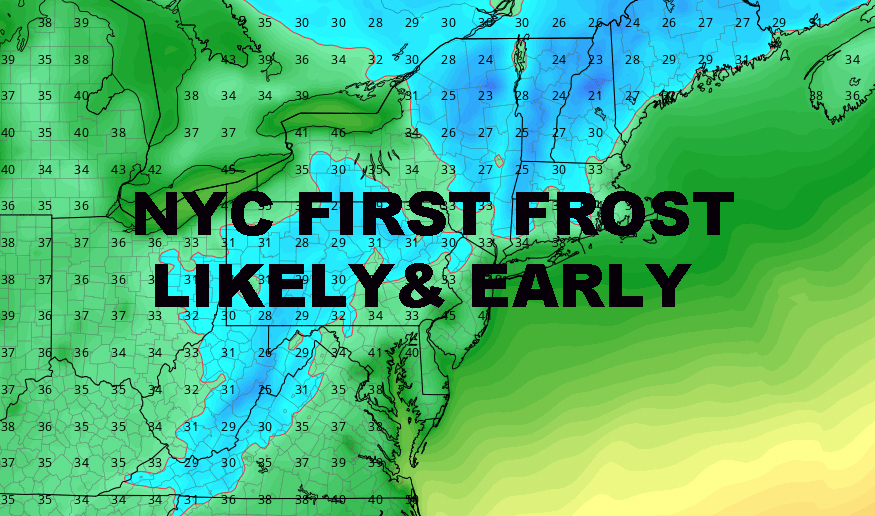 Winds will subside somewhat overnight tomorrow; how much they subside and when will be the deciding factor if New York City sees it’s first frost for Monday morning. As of now it looks as if that’ll happen with lows in the low to mid 30’s. It won’t be a heavy, widespread frost, but it’ll a first frost nonetheless and approx. 3-4 weeks early on average. Parts of Long Island have seen their first frost already and they were slightly earlier than average, but 3-4 weeks early for NYC is rather impressive.