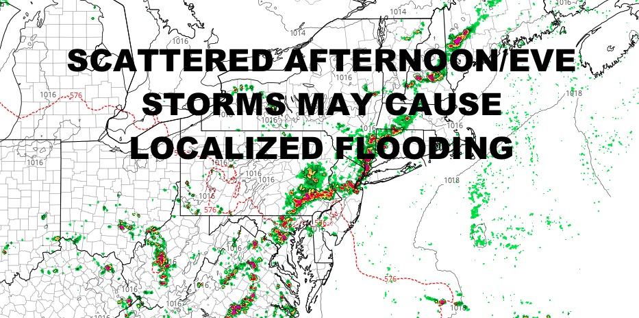 Good morning everyone. Our deep-summer pattern continues today as some juicy air will be responsible for scattered, slow-moving PM storms. Flood watches range southeast and central NY, all the way down into Virginia for the prospect of flooding due to scattered storms remaining over areas for a prolonged amount of time. After today, we go hotter with temps peaking on Friday in the mid 90’s before “cooling off” back into the upper 80’s next weekend.