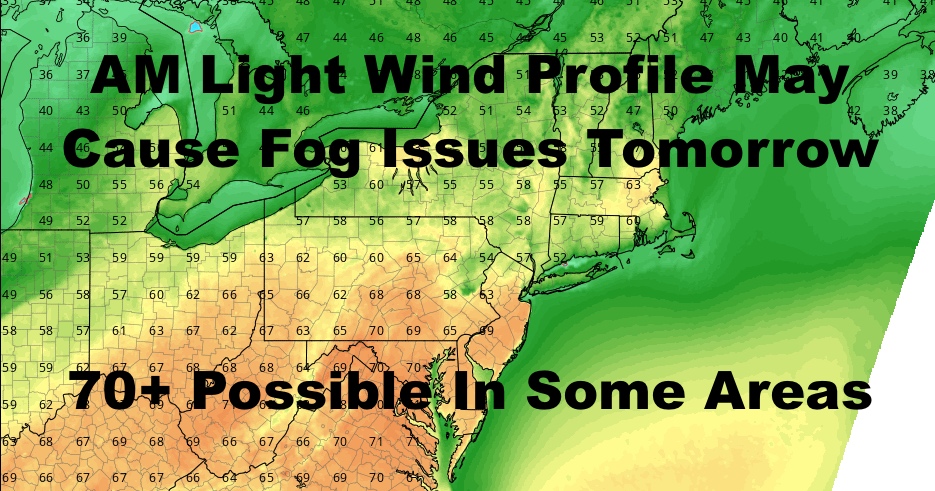 The marine layer departing tomorrow AM, combined with light winds in the morning, will help touch off some fog as that warmer airmass clashes with the cold ocean. We’ll see how long that fog sticks around, but if it’s gone by mid-morning we could break 70 in parts of NYC. If the fog is stubborn, mid to upper 60’s will be the best we go. Regardless, areas along the south shore of LI will be cooler than spots several miles inland.