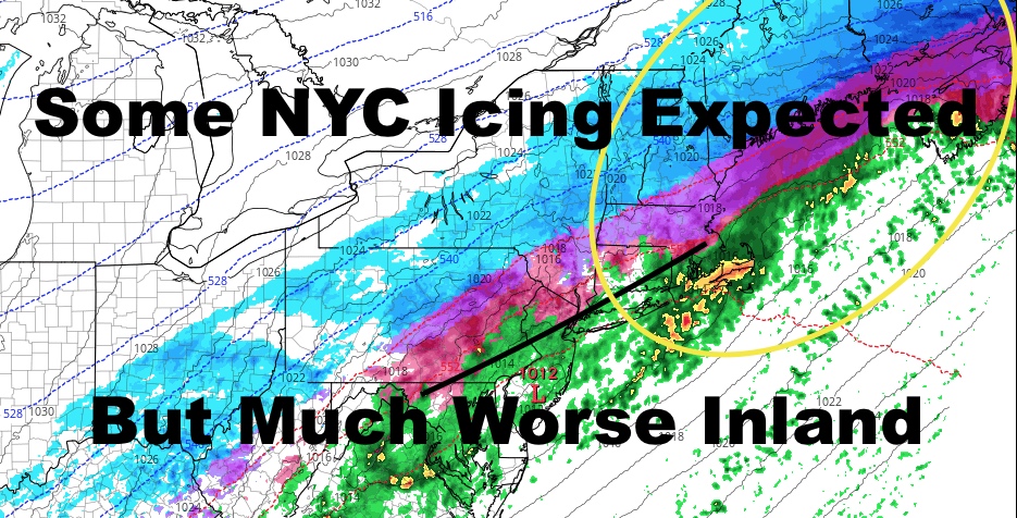 Look for an AM cold rain, then mixing with sleet and freezing rain some time between 10am and 2 pm. By the time the cold air reaches us, the majority of the energy is well to our northeast, so we aren’t expecting a major accumulation of ice compared to areas up north. However, it doesn’t take much to cause a problem, and I feel extreme northern spots in the City could have moderate issues. Northern Manhattan, the Bronx, and maybe even the northern fringe of Staten Island, could see some complications compared to the rest of the City and Long Island.