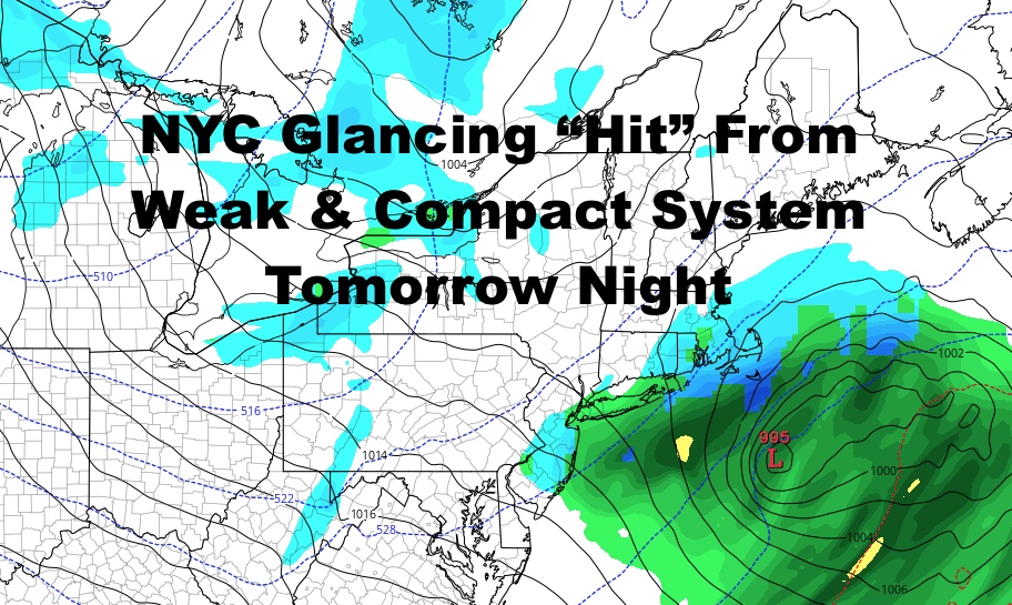 Tomorrow, we have energy moving out of the Tennessee Valley and into the Northeast/Mid-Atlantic. This is a weak area of moisture and things are looking like a glancing blow at best, with low pressure developing too late and heading far enough to our south. However, we could see some light rain showers developing late tomorrow and into the evening. Highs tomorrow in the upper 30’s to low 40’s.
