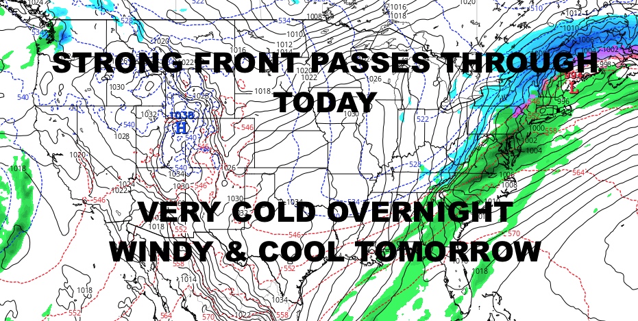 Rain will continue for a couple of more hours, then we’ll have partial clearing and dropping temps. Right now as I type, we’re near 60, but temps will fall through the 40’s then 30’s. Overnight lows will be in the mid 20’s in most spots with windy conditions.