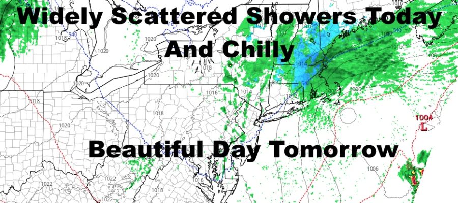It won’t be raining all day today, but as low pressure begins to move out of the region, sun (not sunshine for us), will work the atmosphere and help touch off some scattered showers. The same low pressure is helping pull chilly air down to the surface, and we’ll be in the 45-50 range today.
