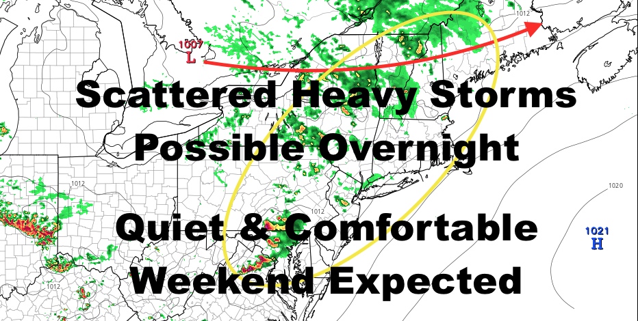 We start off with sunshine today, then increasing clouds late as low pressure transits from the Great Lakes into upstate NY and then New England. The majority of the energy will go to our north, but there will be enough trailing southward to spark some scattered gusty showers and storms in our area later tonight and into the overnight hours. Not everyone will see action, but those that do may see some locally strong to severe weather, especially upstate where small hail and strong winds are possible. Highs today will be in the low to mid 80’s.