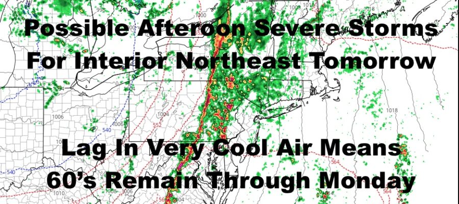 Clouds will increase tomorrow night, with some widely scattered and brief showers developing by sunrise into Thursday late morning. As the day wears on, we will be watching a line of storms developing in Central PA and NY. Those will march eastward, but we’ll have to watch the timing of the front to see if they can hold onto some energy. At minimum, the interior northeast has a decent shot at seeing some severe weather, with the biggest threat being damaging winds. We’ll see if they can hold onto some juice as they enter the picture here some time between evening and later on in the night. Highs will be a humid and breezy near 70/low 70’s.