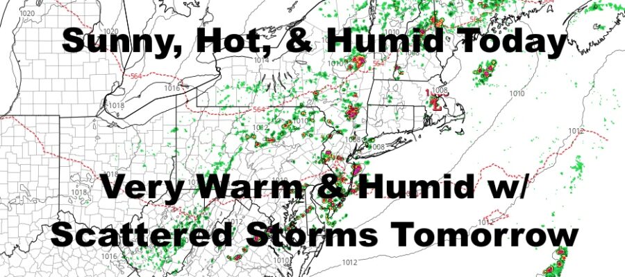 Good morning everyone. We have a hot one ahead of us today and a very warm & thundery one tomorrow, but relief is on the way for a couple of days. Plus, your weekend is looking like a split, with some questionable weather possible on Sunday.