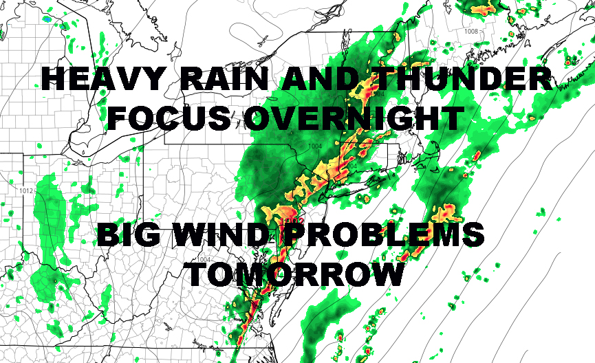 Expect cloudy, breezy, and humid conditions to persist today. As stated, most of the energy was going to go well north and west of us today, but a wave riding along the front will get us in on the action later. Look for cloudy skies with a chance of a heavy shower and rumble of thunder at anytime throughout the day today. Highs will remain where they are now temp-wise, with mid to upper 60’s in most spots.