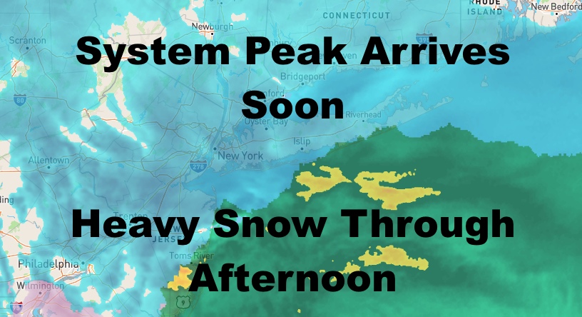 Good snowy morning everyone. We had an interested night as heavy snows moved in earlier than expected a few days ago. That’ll help add to our totals when this is all said and done, and why we went with higher numbers yesterday morning for the final call. As of now, mixing hasn’t happened yet along parts of Long Island, so that’ll help give some of these areas the higher end of the spectrum in the snow forecast, or that “+” I put in.
