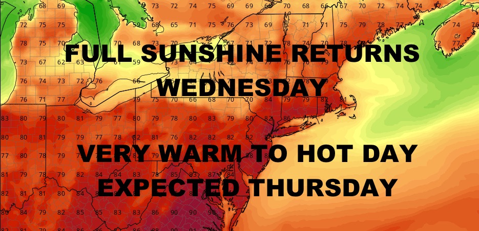 Good afternoon everyone. We have some remnants of sunshine going on right now, then clouds increase with the risk of some showers. We’re in this mostly cloudy/smei-gloomy period through Tuesday, then Wednesday and Thursday look promising. That being said, look for very warm to hot and humid conditions on Thursday before our next system starts knocking on our door.