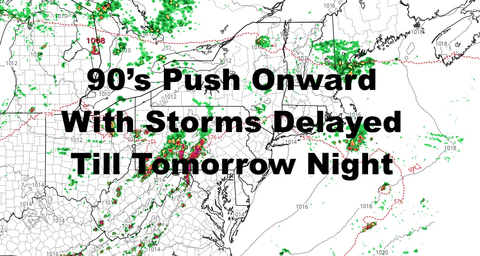Good morning everyone. Our “bonus” day of very hot weather is here, but we have some more “bonus” to speak of in terms of hot to very hot weather in the immediate forecast. Showers and storms that were supposed to pay a visit tomorrow and “sink” our temps back down into the upper 80’s, will be delayed long enough to give us another 90 degree day tomorrow. Thursday was expected to be a hot one in the 90’s, so nothing has changed there, but we will have now strung along 90-95+ degree conditions for what will be 6 days in a row.