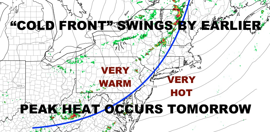 Good late morning everyone. We’re watching the heat closely as a cold front arrives a little bit earlier than expected. This will cut the hottest temps down by 1 day, and tomorrow looks like the sizzler instead of Friday. The weekend is also looking more like a split decision, with numerous showers and storms possible on Sunday.
