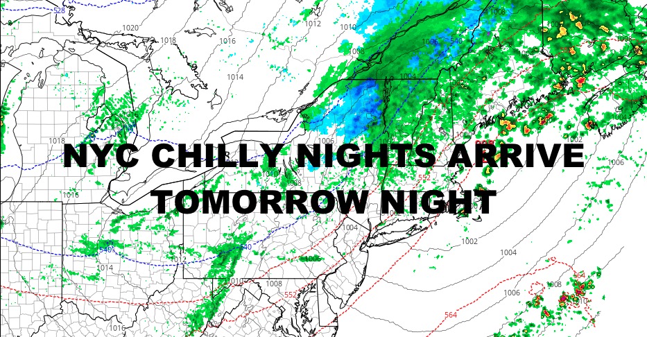 We’ll have a few AM showers and clouds tomorrow, followed by partial clearing. Highs will be in the mid 60’s with a breeze developing. Tuesday looks breezy and very cool, with highs in the mid to upper 50’s. Same goes for Wednesday, but some areas may not get out of the low 50’s. We could also see some 30’s and frost away from the NYC area.
