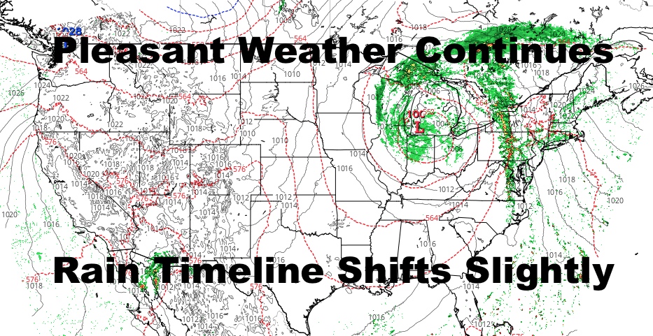 Clouds will be on the increase tomorrow, but I think the rain holds off for the most part. We’ll have the slight chance of a late shower, and highs will be near 80 with more humidity.
