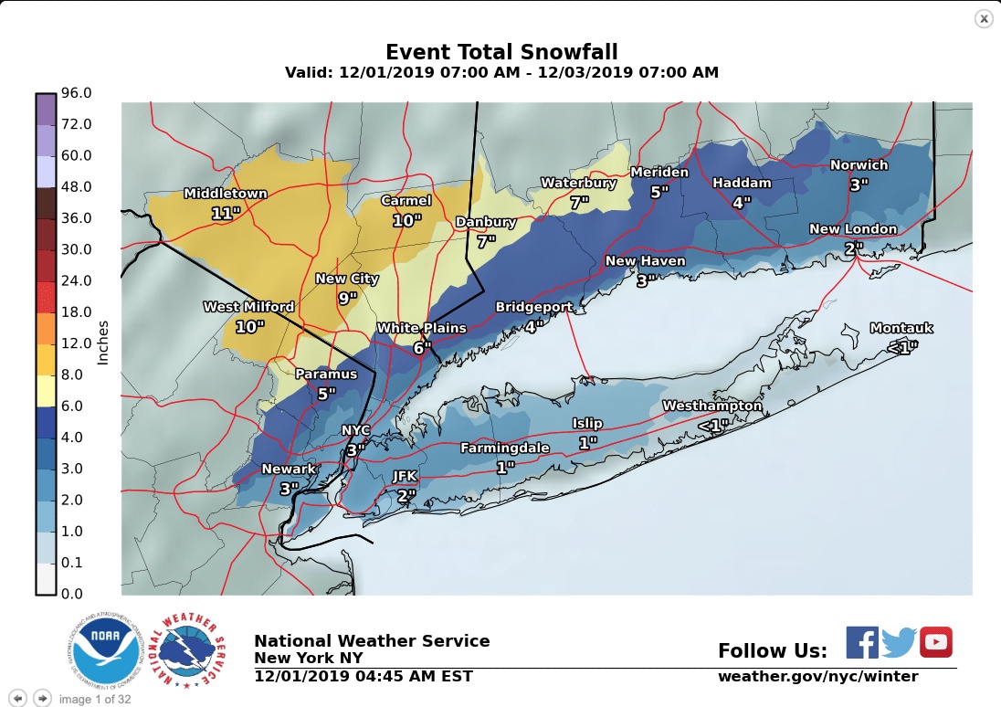 Let’s take today’s frozen precip out of the equation and talk about what you’ll visually see tomorrow/tomorrow night. Expect a trace – 2″ of snow in central Brooklyn, central and northern Queens, central and northern Nassau, and parts of central and northern Suffolk. The south shore of Long Island and East end remain on the low side, with a trace -1″ possible.