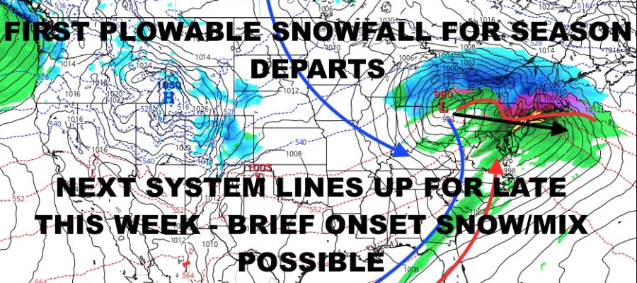 Good morning everyone. We have our departing system keeping clouds socked into the area for most of today with a few lingering sprinkles or scattered light rain showers. Forecast-wise for this system, we did fairly well. I stated the past few days that we would have both upside and downside surprises existing at the same time, and this rang fairly true. Most of the North Shore of Long saw the “best case” scenario play out, with many spots in the 3-5″ range. As you went out to Eastern Suffolk, many spots saw 2-3″. The South Shore came in lowest, with many coating – 2″ reports. Areas N&W of NYC saw a healthy 4-8″ dumping of heavy wet snow.