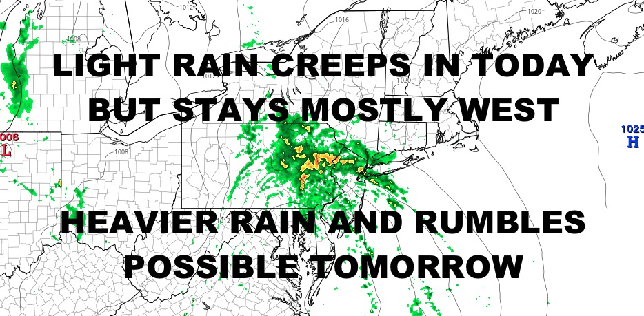 Good morning everyone. Clouds are beginning to creep in, lower, and thicken; and rain isn’t too far behind it. The majority of the energy goes to the west of us today, but on & off light rain will clip the area throughout the day. Overall, we begin another gloomy period that’s not 100% gloom all of the time, but the majority will feature clouds and some sort of moisture lurking around.