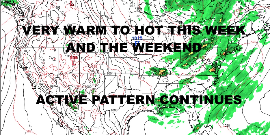 Good morning everyone and welcome to deep summer. Our pattern still remains a little wonky as far as these fast moving systems and rainy/thundery periods, but we’re able to get some heat out of this as well. That heat will be with us throughout the next 7 days or so, then we’ll be watching closely for the prospects of a possible heatwave sometime between the 19th-21st of July, onward. Extreme heat is looking to build into the upper Midwest, then drift east as our active pattern finally begins to slow down a bit. In the meantime, look for showers and storms to come and go after 2 rain-free days today and tomorrow.