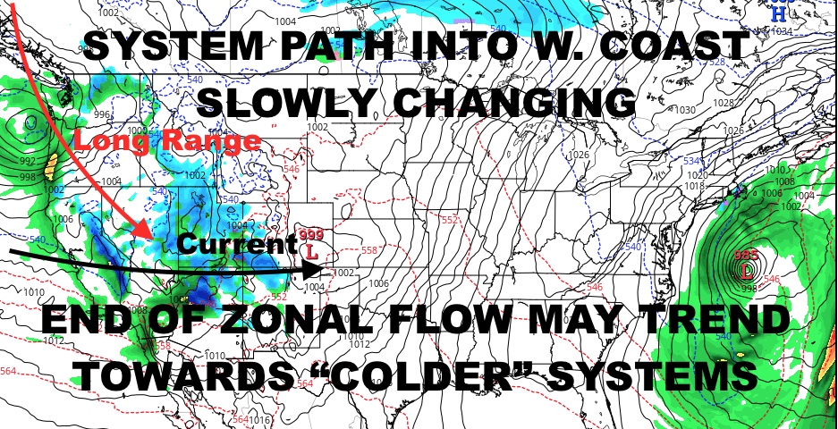 Even though there are no major snow storms on the horizon and we remain looking mostly wet, we are watching some subtle changes on the West Coast over the next 2 weeks that may begin to change things a bit here. Instead of a direct head-on collision with each system on the West Coast, we will begin to see them diving into the Northwest and head southeast into Nevada and Arizona/New Mexico.