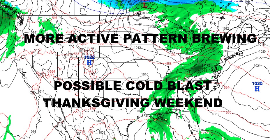 Looking into the long range, we have a few more opportunities for rain over the next couple of weeks. It looks as if a more active pattern is starting to take hold, which will slowly (and I mean SLOWLY) lessen the drought conditions. We also see the chance of a fairly sizable cool to cold blast sweeping though some time during your holiday weekend in a couple of weeks.