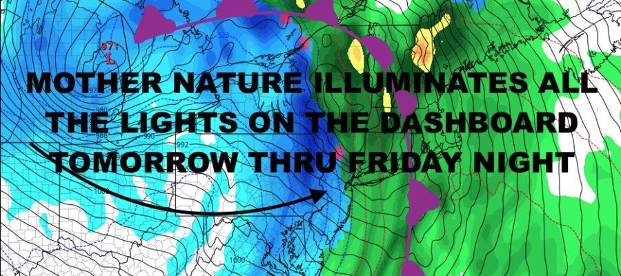 Good morning everyone. We have one more quiet day today before the storm clouds gather tomorrow, with a major storm bringing with a wide array of severe weather conditions. As I’ve said before, regardless of the precip type for NYC and Long Island, this is going to be one ass-kicking storm; leaving some asking themselves when this is over, “what the hell was that??”.