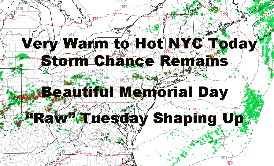 Good morning everyone. We have a very warm to hot one on our hands today; a taste of summer in NYC a little less than a month before summer officially begins. We could also have some locally heavy boomers around later, adding to the ambiance of what summer should be. That’ll help clear the air for tomorrow, then the gloom monster returns for a 1 day poke in the eye, but your plants will love the break.