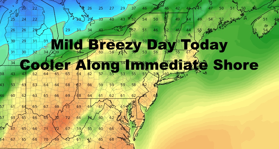 Expect more clouds than sun today with a strong, steady southerly breeze. That’ll hold temps down in the 50’s for most coastal spots and eastern Long Island, but NYC proper and interior western/central sections of Long Island, should see widespread 60-65 degree temps. Any areas that see a few extra peeks of sunshine, could creep a little higher.