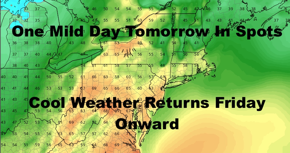 Good morning everyone. We have a chilly day today with some light rain possible as a warmer airmass heads in, but it’s only around for 1 day before below average temps return. We remain in an active pattern, and there’s not much mild air to be found aside from system-related, 1-2 day hits here and there.