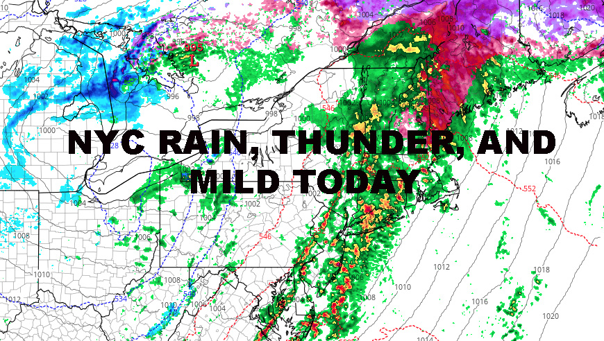 NYC MILD RAIN THUNDER TODAY – Good morning everyone. Mild air, heavy rain, and rumbles of thunder are knocking on our doorstep as promised. This is courtesy of a long reaching and stretched out frontal system, with low pressure heading well to our north.