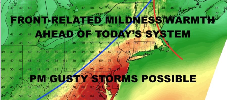 Good morning everyone. We’re starting to see some of those low clouds and fog break up, and we will be very mild to even warm in spots across the NYC Metro Area. Scattered showers and storms move through later on, but the majority of the action should be well south of us; with lower NJ, extreme SE PA, MD, DE, and VA getting the brunt of a gusty line.