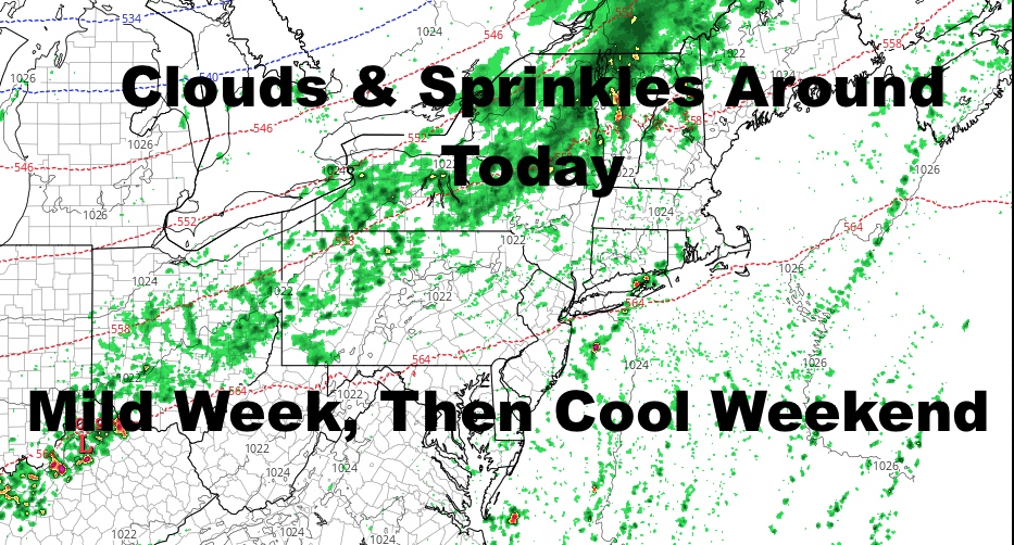 Good morning everyone. We have clouds and sprinkles around today as a reinforcing shot of cooler air fails to push in the NYC area. This was expected as is the foggy and cloudy morning tomorrow. Eventually we’ll get into some partial clearing and we’ll finish off the week mild, but cooler air is heading in for the weekend.
