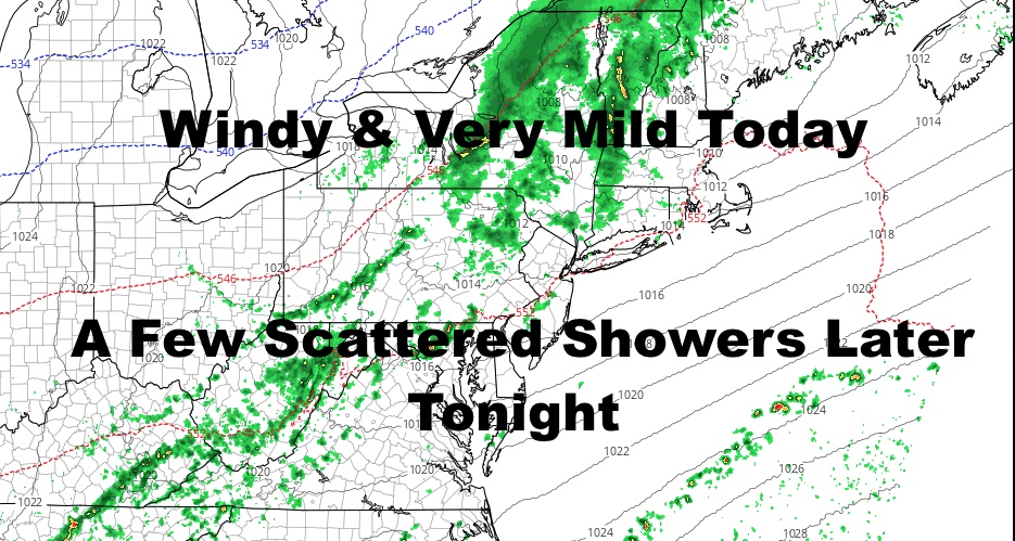 Look for morning blue patches before the sun goes away. We should have enough mild air left to hit the 60-65 range, but it’ll be a windy one ahead of that front, especially at the south-facing shores. It’ll also be cooler at the shores with that wind blowing over the cooler oceans. Highs will be similar to yesterday and in the mid to upper 50’s at the beaches. A few scattered showers are possible as we go one in the day, but nothing of significance.