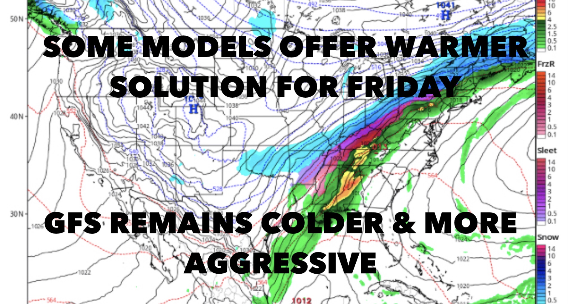 We’ve seen in the past that models, particularly the GFS, doesn’t handle these types of scenarios very well. Many times, they go very aggressive with the changeover to ice and snow. In this case, the GFS is doing just that, while the Canadian and NAM are offering a warmer solution, plus less moisture to work with once the front passes.