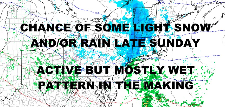 Good afternoon everyone. We have a sunny, breezy, and cold day today before our next week system begins to arrive tomorrow. Enough cold air will be in place to probably start things out as scattered light wet flakes, then change to a mix/and or light rain before it ends. Other than that, another system arrives on Wednesday with a similar outcome for the moment.
