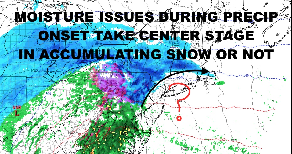 That’s cold enough to give us some onset snow, but the radar will be a big issue in the morning. Does precip arrive quick enough to give us a coating before temps climb above freezing? Does it arrive at all before it’s too warm to even snow? These are all valid questions, which is why I’m sticking to my “little to no accumulation” forecast from yesterday, but we’ll leave the door open a smidge to make room for any surprises. Either way, a “surprise” at this point for NYC and Long Island would probably equate to a coating to an inch as opposed to a 1-2/2-4″ type snowfall.