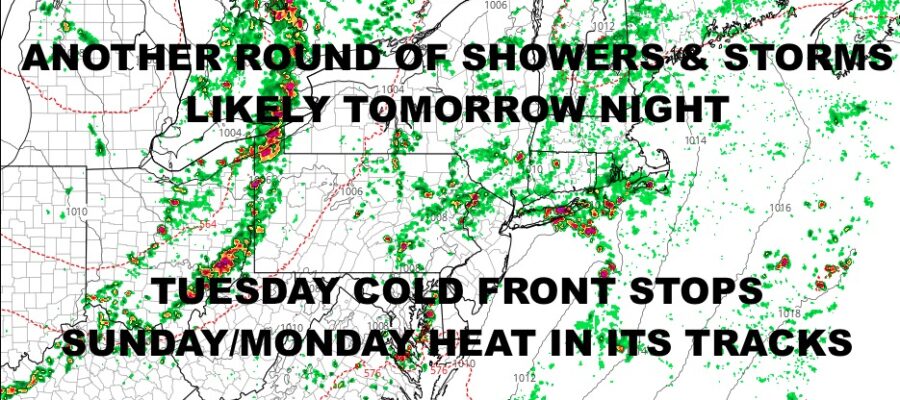 Good afternoon everyone and welcome to our mish-mosh of a pattern going on right now. Not only do we have the chance for more showers and storms in the Northeast, but we also have some pleasant weather mixed in with hot weather, then pleasant again. The shower and storm risk is courtesy of another spoke of energy that’ll be moving through tomorrow late evening into Friday AM; and the pleasant weather after a two day bout of heat, will be courtesy of a pretty formidable cold front. Moisture content and timing is suspect, but there will be a big difference in air masses from Monday to Tuesday.
