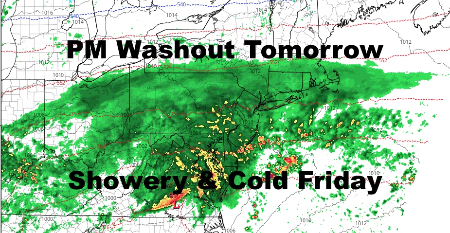 Friday will be a rough one as a secondary wave keeps the rain and clouds socked into the area. Colder air will lock in, and there could be some snow in higher elevations well upstate. Locally, we could see a few wet globs of snow mixed in before precip ends, and most likely you’ll see those globs best if you’re driving as they hit the windshield. It’ll be mostly rain though, and a cold one at that with highs in the mid 40’s at best.