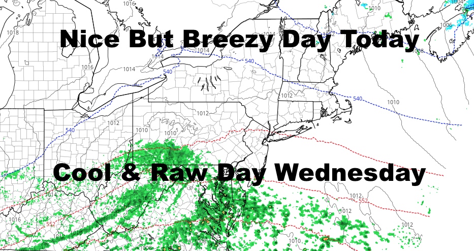Wednesday will start out with some sunshine, but a weak disturbance will slip just south of us, bringing clouds our way. We’ll have the slight chance of a light shower in the afternoon/eve, and highs will be a raw mid to upper 50’s with that NE flow.