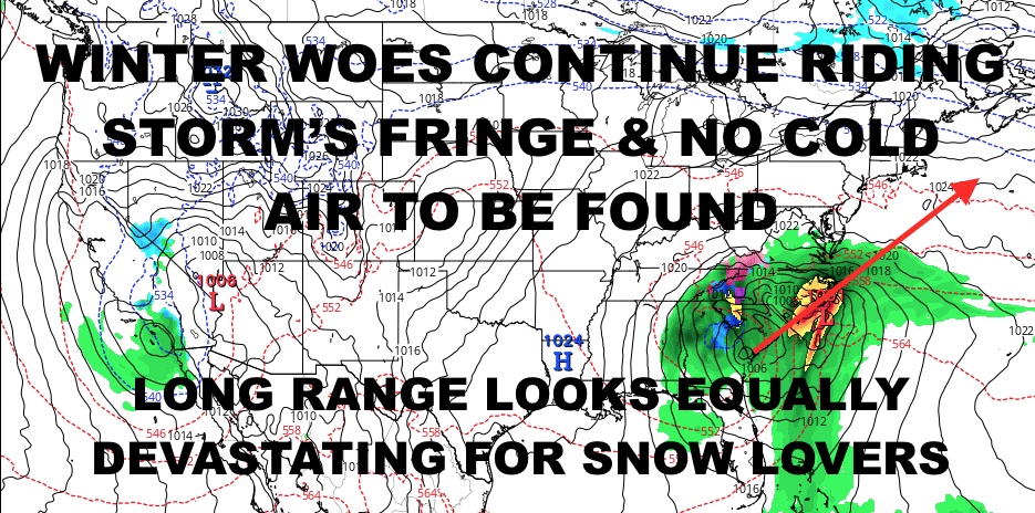 In the long range I have nothing. We were hoping that the deeper diving systems out west would help knock the jet stream a bit to our east, but all it’s really doing is making a sharper turn into the Ohio Valley/Great Lakes region. This equates to warmer solutions for us every time, or coastal systems that scoot well to our south and/or develop late and well offshore.