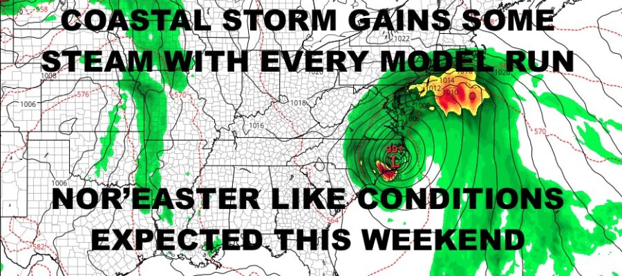 We have a chance of some rain overnight Friday, but the bulk of the rain is expected Saturday. Expect rain, heavy at times, with windy/gusty conditions. Strongest winds will be felt along the immediate shore for a very Nor’easter-like feel. We won’t go into wind strength yet, but I think 20-30mph with some higher gusts is a good bet at minimum. We could also see some coastal flooding during high tide cycles as we do with any given Nor’Easter. Highs in the mid 60’s at best.
