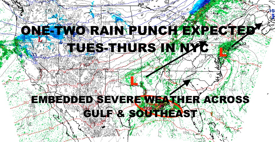 As low pressure emerges and taps the Gulf moisture Tuesday, cold air behind the system will allow enough contrast in air masses to spark off several clusters of heavy showers and storms. Initially, we’ll be watching extreme eastern Texas on east towards Louisiana and the rest of the Gulf States; but another wave of low pressure (which will become the main one to charge into the Northeast), could set off another round of storms which could reach severe limits. Our storms Tuesday and Wednesday from west to east, could contain torrential rain, frequent lightning, large hail, and tornadoes.