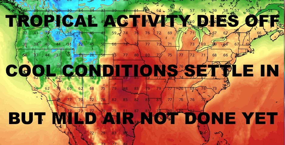 Good afternoon everyone. Our cooler air is heading in and that will be the “big story” over the next couple of days, but we also have other things going on overall. The tropical activity has come to a standstill, and I also think we’re not done with the mild air yet even though we are cooler this week.