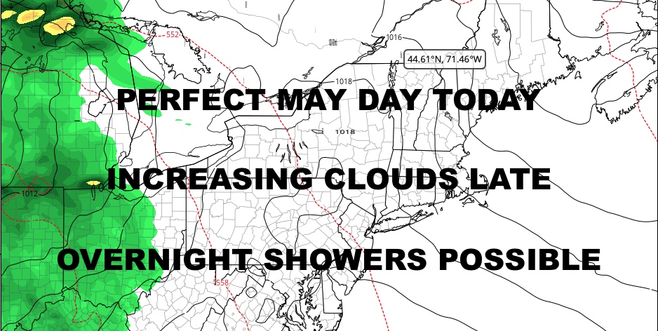 Good morning everyone. We’re off to a fine start today and lining up the perfect spring day for early May. We’ll have some increasing clouds late and overnight showers, but that won’t interfere with the core of today and most of tomorrow. Things will cool down Tuesday and Wednesday, but we bounce back fairly quickly for Thursday, onward.
