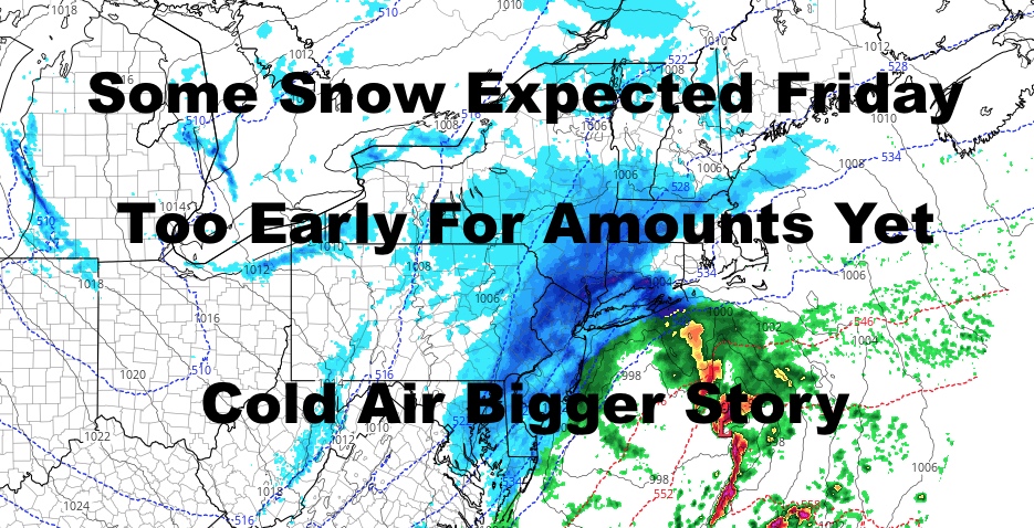 Saturday is looking sunny and cold, with highs in the upper 20’s to low 30’s; then we modify temporarily Sunday with some AM mix possible. That’ll be a reinforcing shot of cold air and next week looks to start out below average temp-wise.