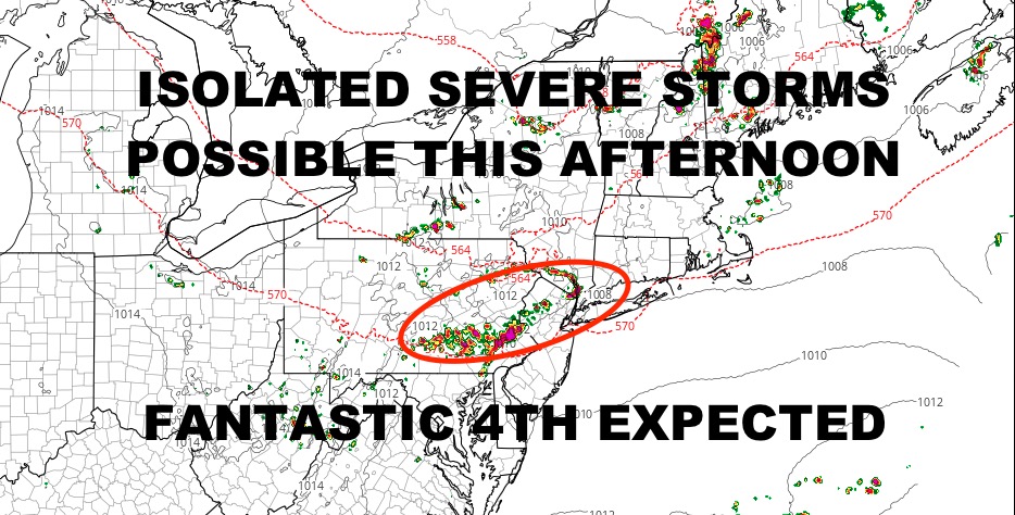 Good morning everyone. After we get through a slight “hiccup” today in the form of widely scattered strong to severe storms, things look rain-free and very warm/hot for the next 5 days or so. This means that your 4th of July is looking epic for BBQ’ing and fireworks at night.