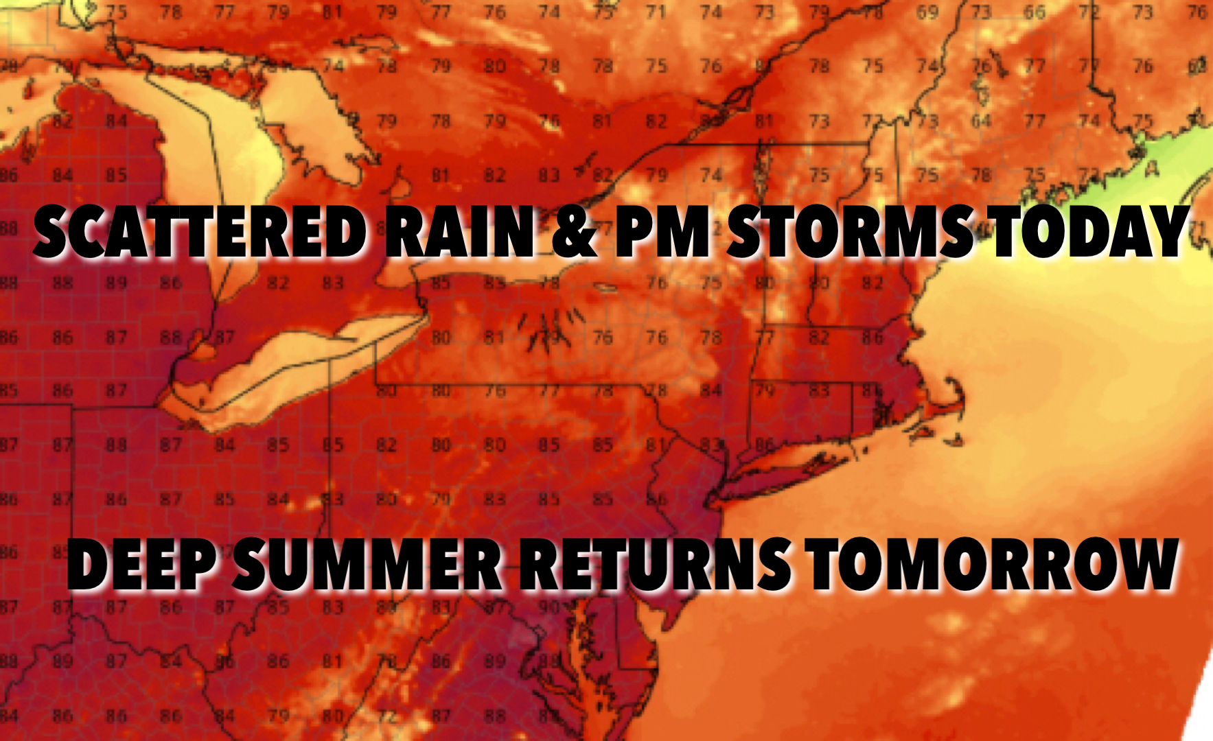 Good morning everyone. Scattered showers and a few rumbles continue to linger around the Long Island area and northeast into New England. It’ll be slow to clear, but we’ll get some blue patches and sun in the region before we start watching the radar again for scattered storms. Heat returns tomorrow and will stick with us through Wednesday, then we see a strong cold front move through on Thursday to give us a comfortable Friday – Sunday.