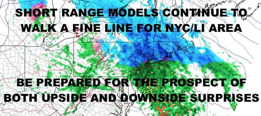 Now let’s talk about upside and “best case scenario” for snow lovers. If enough cold air is trapped, if that secondary low can get going, and if the precip winds up being heavier, we could see a 2-4/3-5″ scenario play out for the NYC area and the North Shore of Long Island. That’ll put the South Shore in a 1-3″ type snowfall before mixing with and turning to rain.