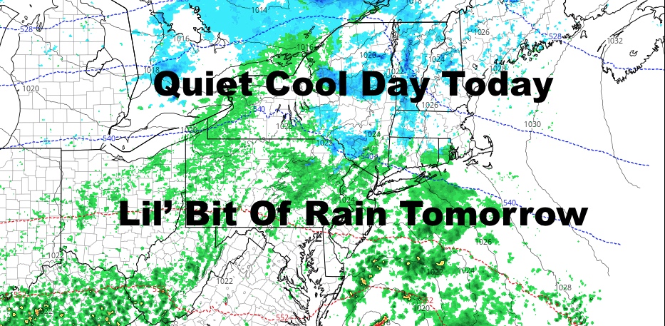 We’ll have increasing clouds today and a steady NE breeze. That’ll hold temps down to the slightly below average realm and in the mid 40’s. That’s just the maritime push and not the marker for true cold air in the area, as lows only drop to near 40 overnight.