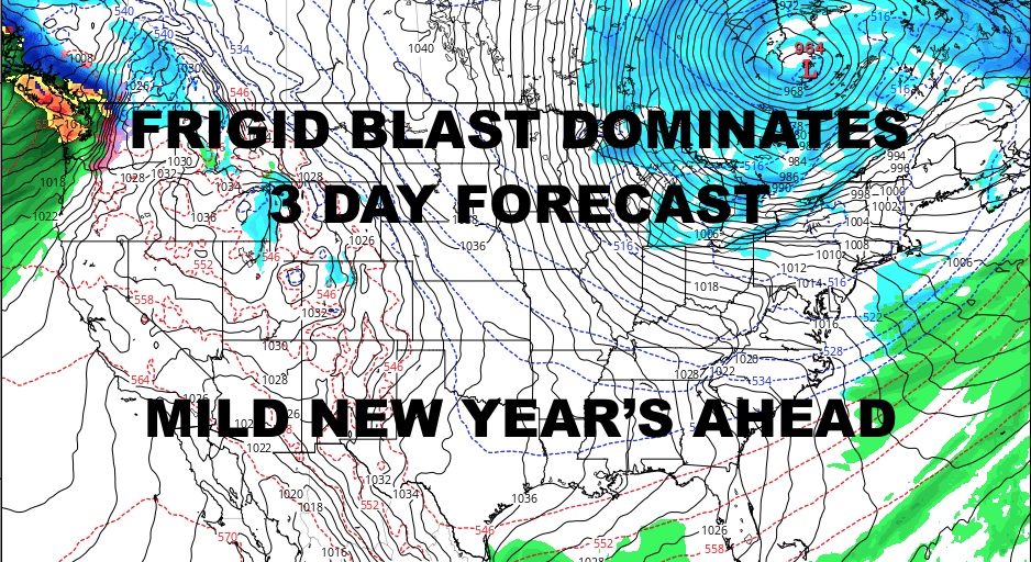 Each day will be in improvement as we see mid 30’s for highs Tuesday, but the nights are still cold with low to mid 20’s. Near 40 temps will grace us on Wednesday, with mid 40’s Thursday, then 50-55 Friday. We remain dry throughout this entire week as our next system hangs back till around or just after New Year’s.