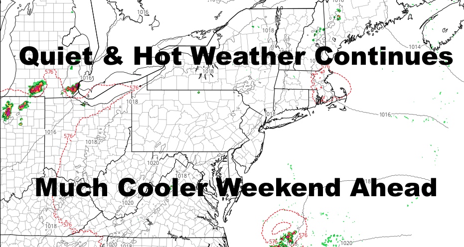 Good morning everyone. Our quiet but hot weather continues onward, and we expect 90 degree temps through Friday. Cooler weather for the weekend remains on schedule, and even then, things will remain quiet. We’re also watching a few features in the tropics, especially some disturbed weather down in Central America. This may pose a problem for the Gulf in the next week or so, but there are no immediate threats to the East Coast right now.